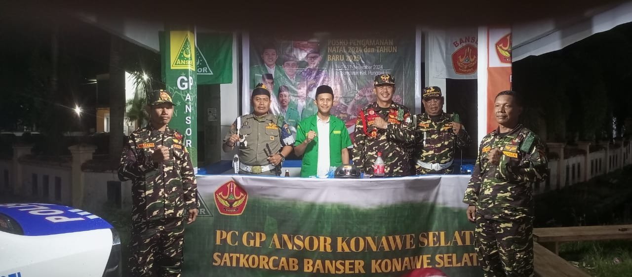 PC Ansor Konawe Selatan/Satkorcab Banser Konawe selatan mendirikan posko pengamanan natal 2024 dan tahun baru 2025 sejak 24-31 Desember 2024 bertempat di Bundaran Kelurahan Punggaluku Kecamatan Laeya.